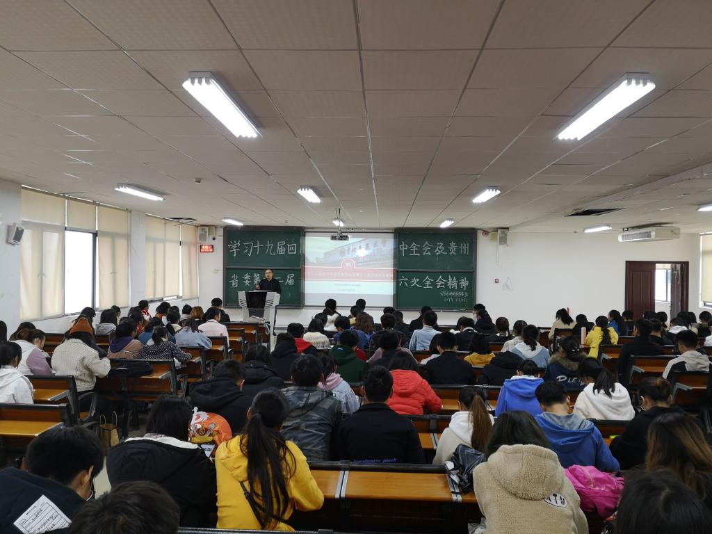 会上,熊树林就十九届四中全会的召开背景及重要意义等方面给同学们做了介绍,并从十九届四中全会的指导思想、总体目标、总体布局、显著优势等方面带领同学们一起进行学习。同时进一步学习了十九届四中全会中关于坚持和完善党的领导制度体系、人民当家作主制度体系、中国特色社会主义法治体系、中国特色社会主义行政体制、社会主义现代化基本经济制度、先进文化制度、民生保障制度、社会治理制度等内容。随后熊树林还带领同学们学习了贵州省委第十二届六次全会会议决议有关内容。