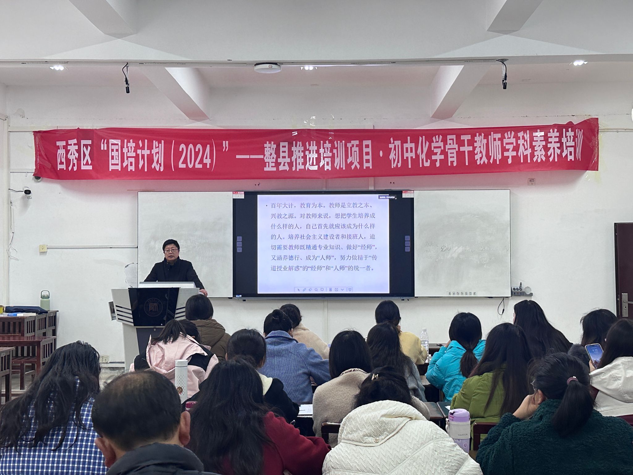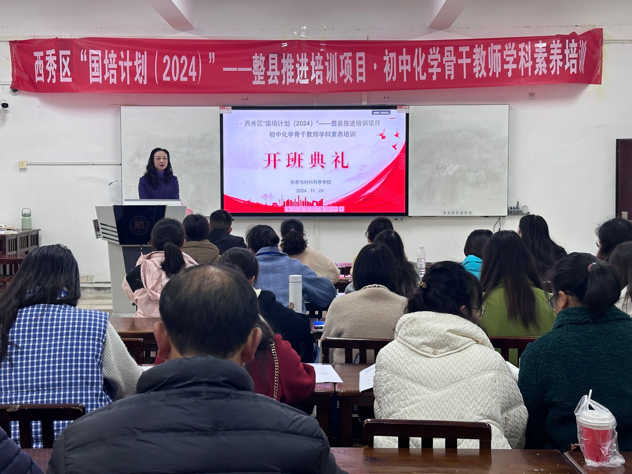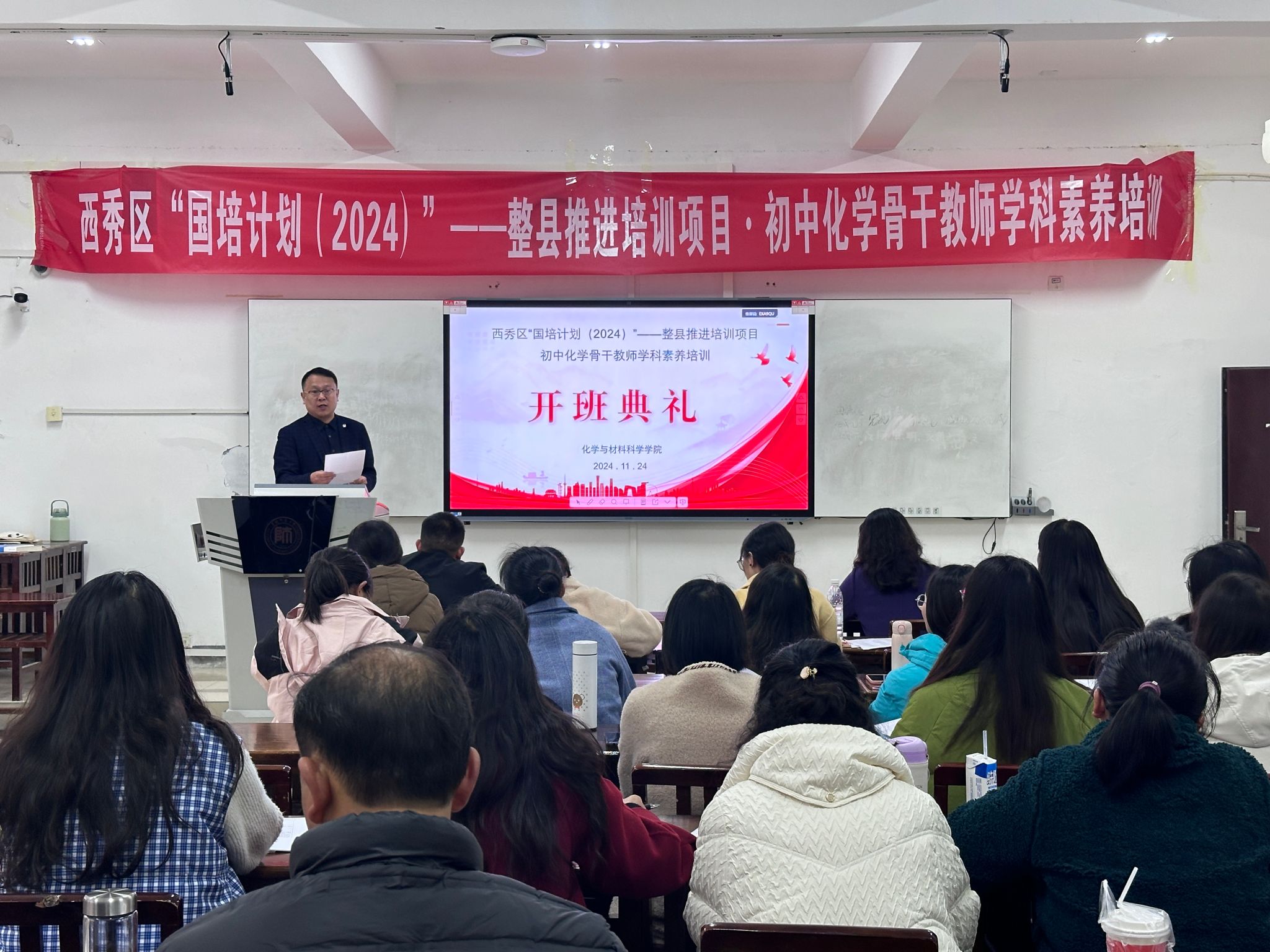 2024年11月24日上午,国培计划初中化学教师学科素养培训在williamhill威廉希尔官网正式拉开帷幕。来自西秀区的50名初中化学骨干教师齐聚一堂,共同开启一段为期7天的专业成长之旅。本次开班典礼有幸邀请到williamhill威廉希尔官网培训首席专家陈卓教授、项目负责人程琥教授、教员工活班主任时少坤老师、专业技术指导刘公园博士出席。