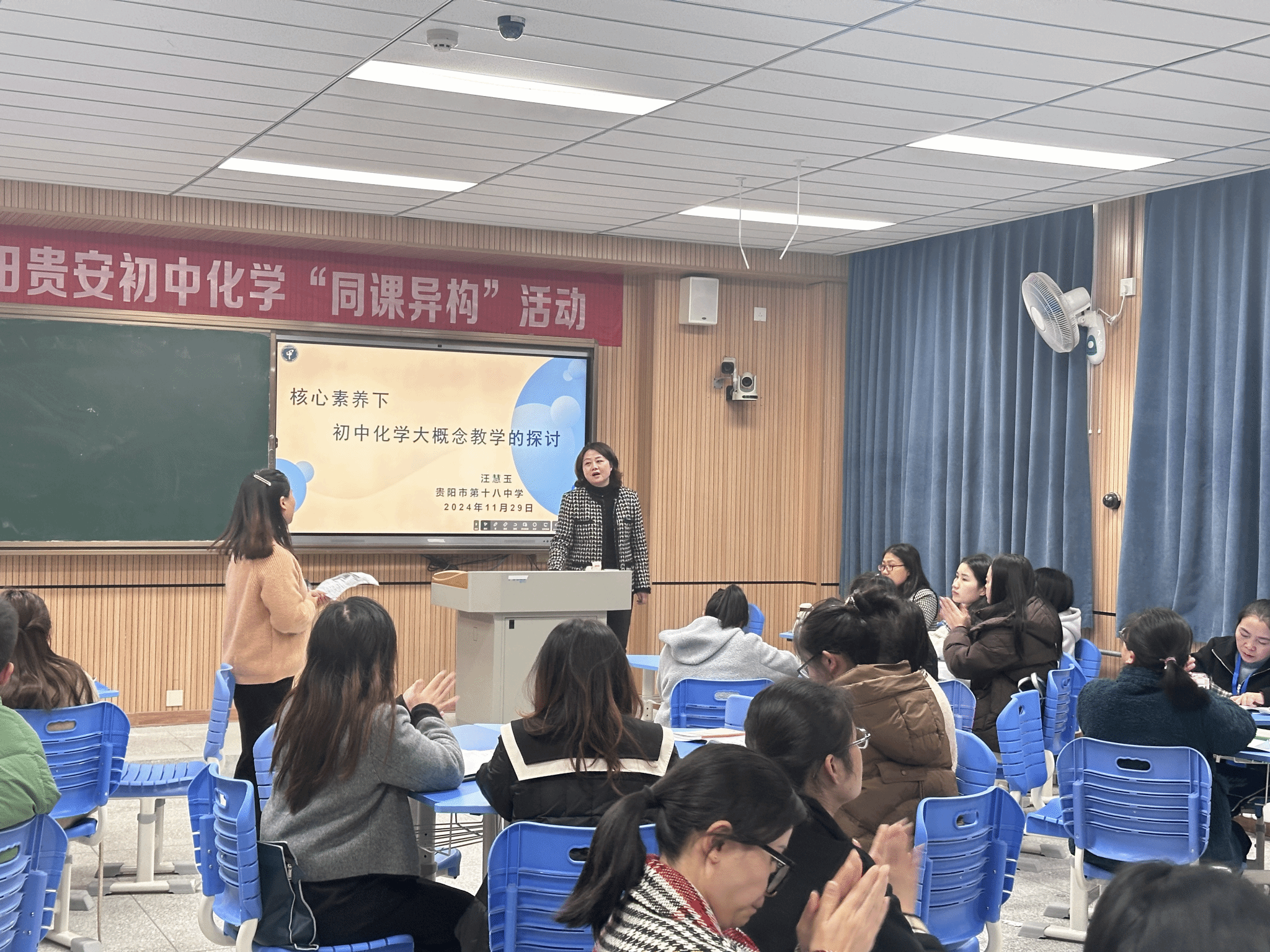 在“国培计划”的引领下,为进一步提升初中化学教师的教学水平,促进教学创新与资源共享,贵阳市第十八中学联合集团校二十七中,于2024年11月29日共同举办了初中化学“同课异构”教学研讨活动。本次活动的课题聚焦于初中化学九年级上册第六单元“碳和碳的氧化物”中的“二氧化碳的实验室制取”,旨在通过两位优秀教师的不同教学设计和课堂展示,探讨多样化的教学策略,提高化学课堂的趣味性和实效性。下午,贵阳市第十八中学教务处主任汪慧玉老师进行了专题分享,旨在通过探讨核心素养下初中化学大概念教学,提升教师的专业素养和教学能力。汪老师指出,当前科学教育领域的一大发展趋势是围绕大概念构建课程与教学体系,大概念不仅扮演着整合碎片化知识、构建系统化知识框架的关键角色,更是培养员工问题解决能力和激发员工创新思维的重要工具。