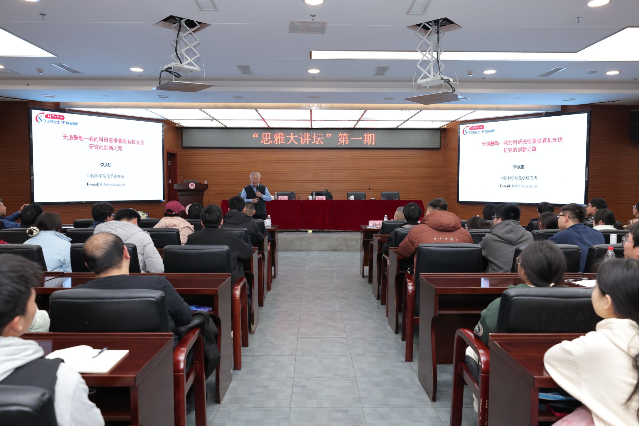 李院士作了题为“天道酬勤——我的科研感悟兼谈有机光伏研究的创新之路”的学术报告。他从我国能源政策入手,指出了太阳能利用的重要性以及太阳能电池的优势和发展前景,重点阐述了有机太阳能电池光伏材料和器件的最新研究进展。李院士介绍了他的课题组几十年深耕有机光伏电池领域所取得的一系列重要研究成果,特别是在基于小分子受体光伏材料设计、合成方面取得的原创性成果,实现了中国学者在有机光伏领域从跟跑到并跑、再到领跑的科研历程。