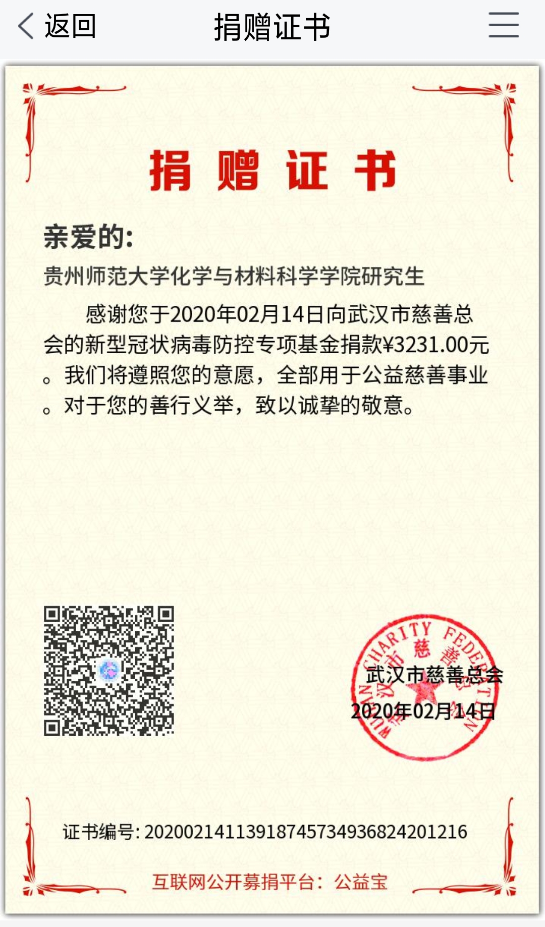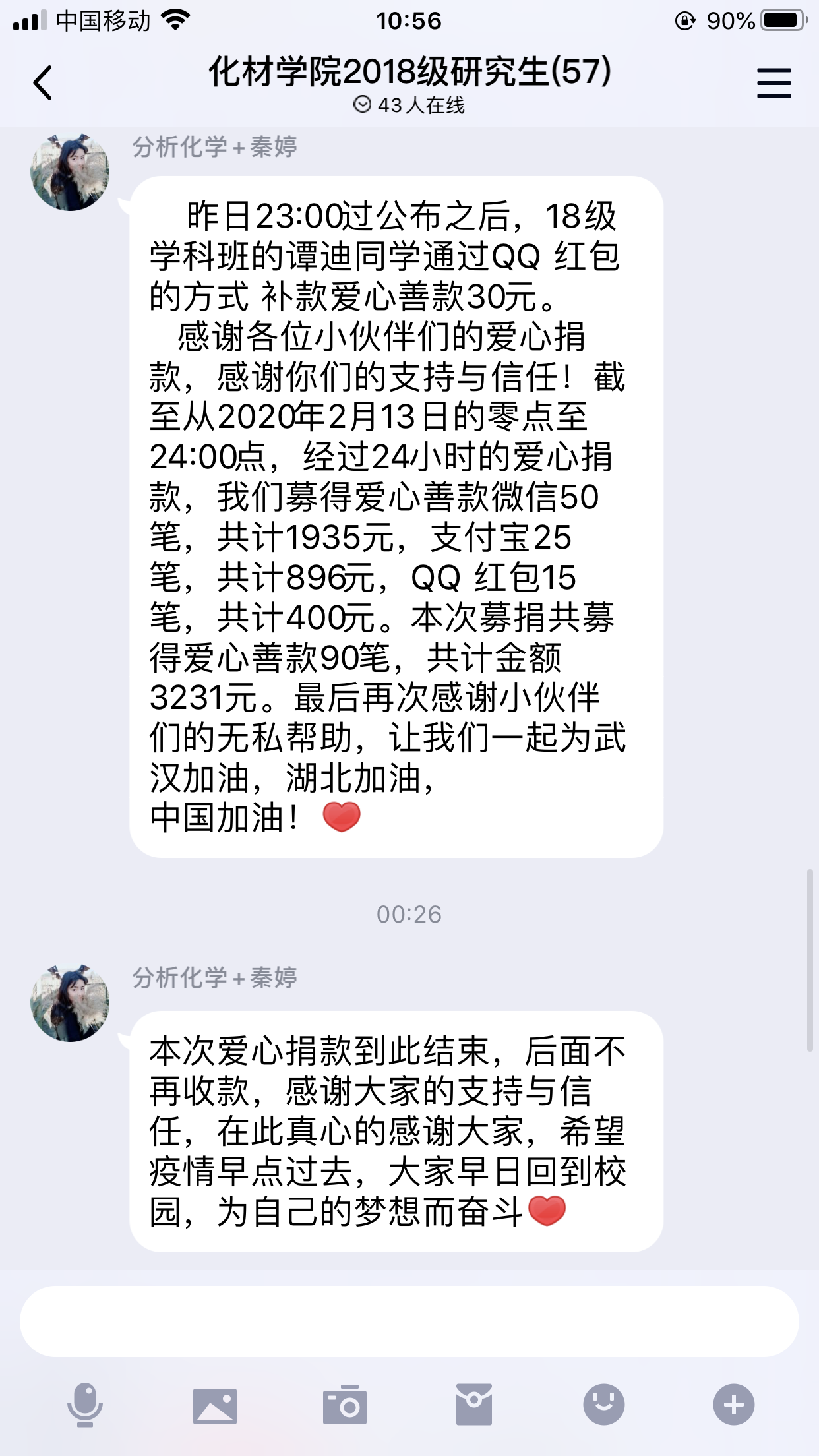 黄鹤楼前,江水汹涌;病毒肆虐,疫情如火。疫情无情,人间有爱;国家有难,我要出力。williamhill威廉希尔官网研究生们自发组织了一场“为武汉加油”的爱心捐款活动。活动倡议发起后,得到了广大研究生们的积极响应,纷纷献出自己的爱心:“我捐20元、我捐50元、我捐100……”截止到2020年2月14日0点,经过24小时的募捐,本次活动共募得爱心捐款共90笔总计3231元。所有善款全部以williamhill威廉希尔官网研究生的名义捐给了武汉市慈善总会,善款将由该组织统一调配,将真情传递。