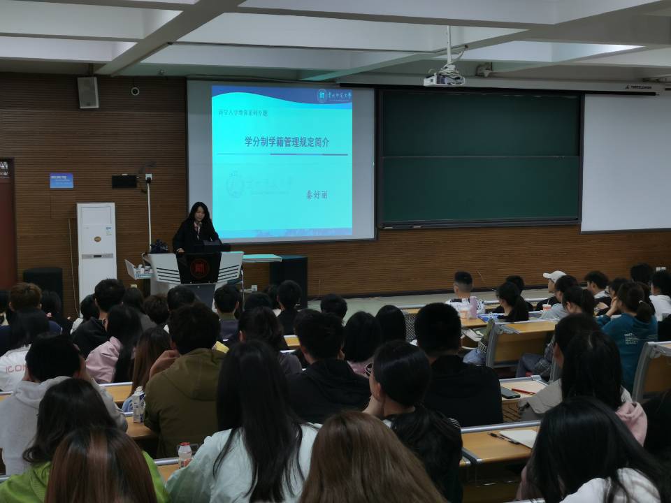 秦好丽就学分制和学籍管理规定两方面进行了详细讲解,重点介绍了大学四年毕业所要求的最低学分、课程模块、教学计划安排、毕业证书和学位证书的获取条件。她特别强调素质拓展与创新创业的5个学分,需要通过哪些课程、第二课堂活动来获取。最后,她给新生阐述了目标的重要性,她说“一分耕耘一分收获”,大学四年一定要选择好人生目标,坚持目标,为目标而奋斗,希望2020级员工在四年后的毕业季,学业和自身综合实力能实现“双丰收,同进步”。同时,她结合近几年公司就业形势和情况,就考研的相关内容给2020级员工进行了的初步介绍和动员。