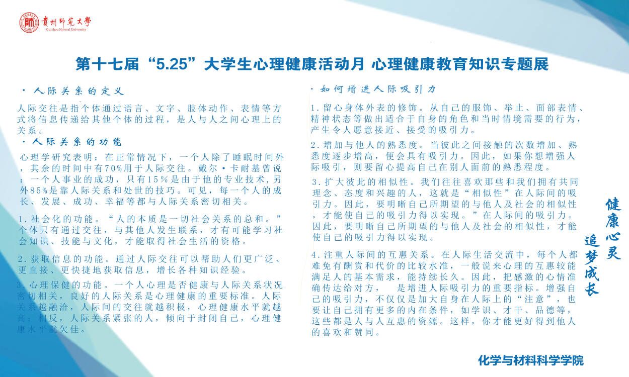 5月18日,公司二级心理辅导站围绕心理健康中的“人际关系”主题设计了心理健康知识专题展板。该展板科普了什么是人际关系,老员工常见的人际关系有哪些,如何增进人际关系吸引力,旨在告知老员工人际关系的重要性,良好的人际关系是一个人心理健康、生活幸福的重要标志。